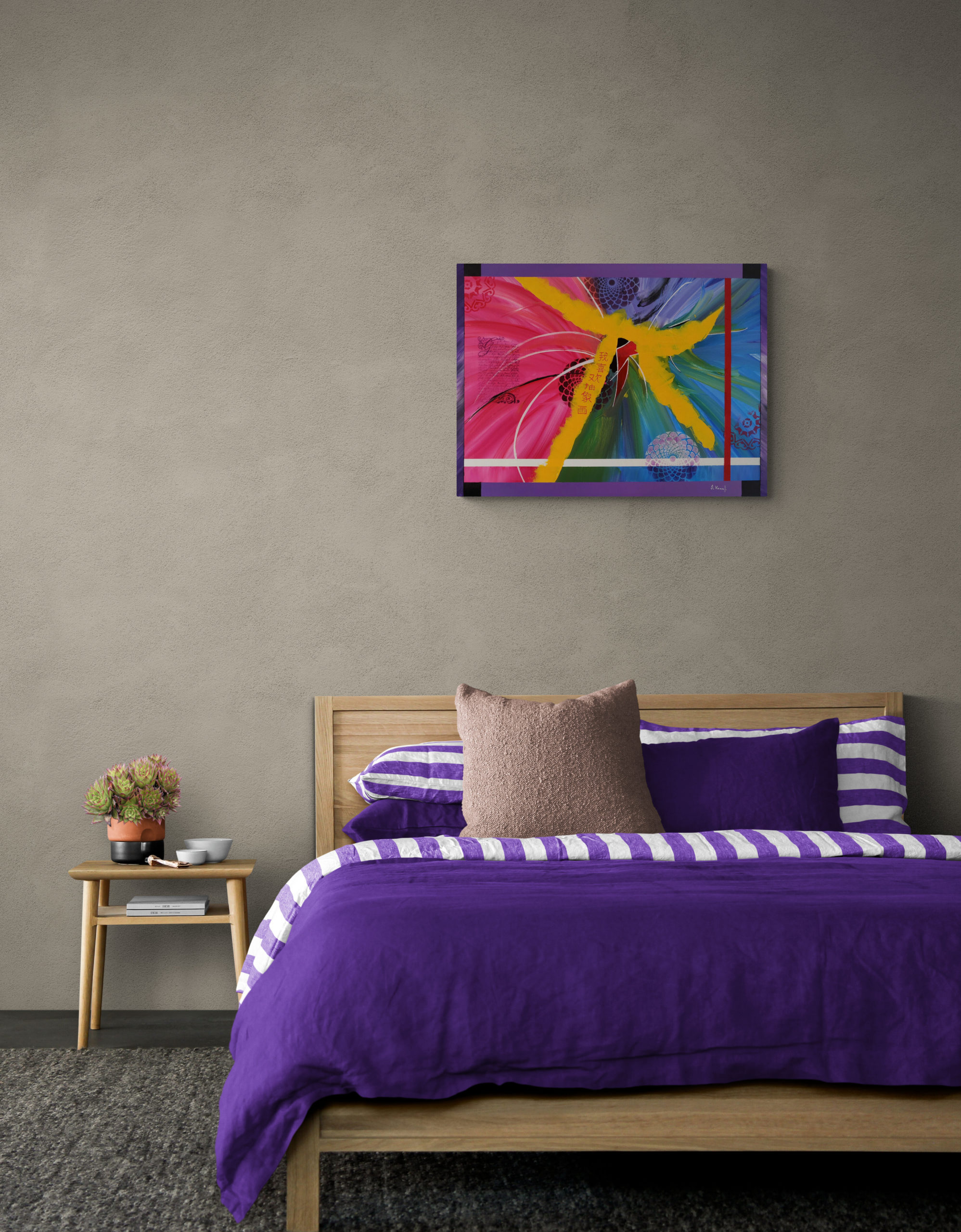 Inspiration Japonaise pour cette œuvre haute en couleurs. Le tableau dispose de trois couches de vernis haute brillance. Il est prêt à poser.
