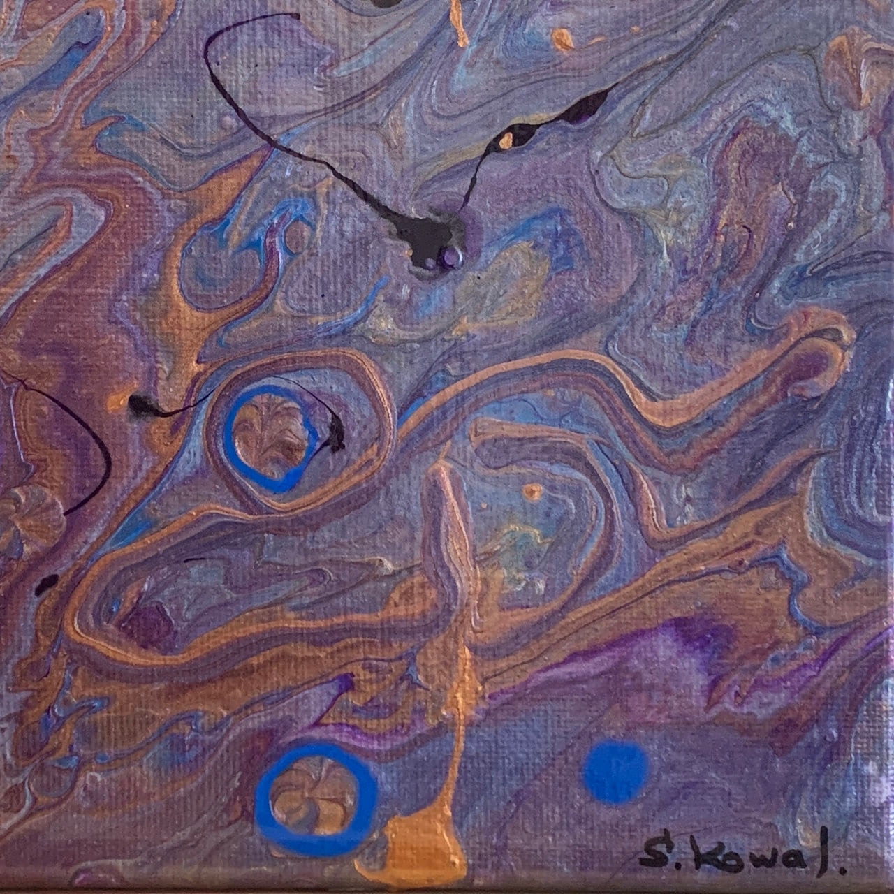 Peinture acrylique abstraite avec technique du pouring. Dominance de violet et or.