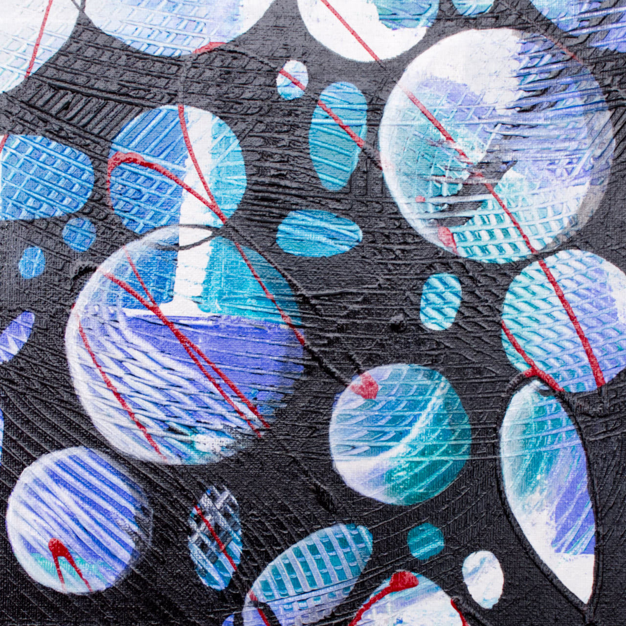 Peinture acrylique en relief avec dominance de noirs et bleus.