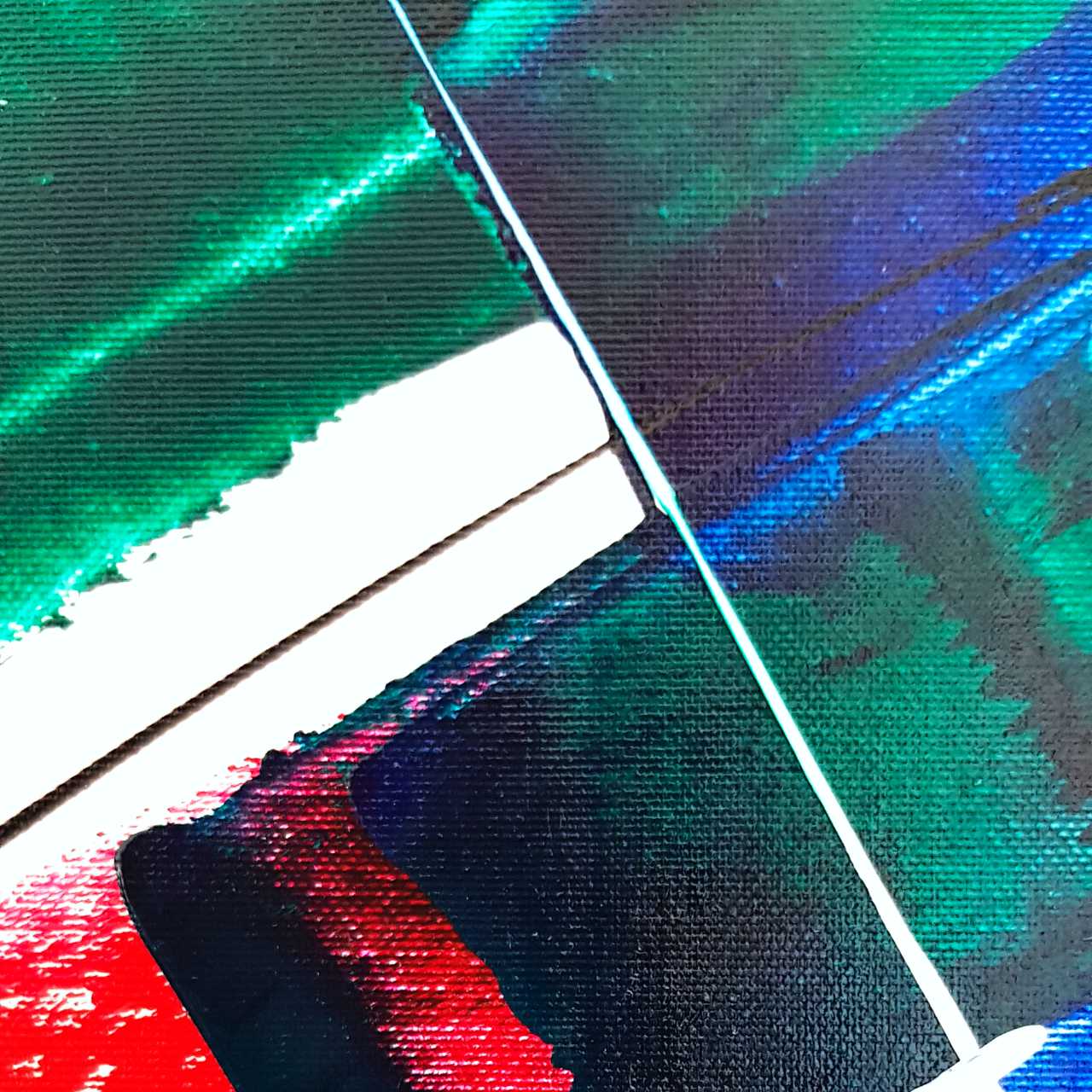 Œuvre contemporaine verticale résolument contemporaine, réalisée à la peinture acrylique. Dominance de vert, bleu et rouge qui donne du dynamisme au tableau.